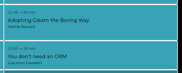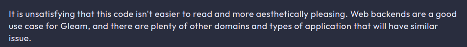 class: middle # Rapidly building with **Gleam** --- class: middle ## **Hi** ### *name -* Peter Saxton ### *@internets -* CrowdHailer --- class: middle  [www.iindy.co](https://www.iindy.co/) --- class: middle  [gleamgathering.com](https://gleamgathering.com/) --- class: middle  [eyg.run](https://eyg.run/) --- class: middle ## The original talk - **Good advice** 1. Focus on the need 2. Seek fast feedback 3. Be boring 4. Eliminate unnecessary components --  ??? I was going to be talking about a lot that you have already heard. So what I want to do is cover some principles and then speculate on the future. Link to all the previous talks. Do 10 x developers exist? Do some projects take 10 times longer than expected --- class: middle ## The new talk - **Wild opinions** 1. *Focus on the need* 2. *Seek fast feedback* 3. *Be boring* 4. *Eliminate unnecessary components* 5. Escape the turing tarpit with your sanity 6. Bash is worse than Gleam 7. Extending types over time and space --- class: middle # Focus on need --- class: middle > Building the right thing is more important building the thing right. --- class: middle  --- class: middle > Management is doing things right; leadership is doing the right things. -- > Efficiency is doing things right; effectiveness is doing the right things. -- > There is nothing so useless as doing efficiently that which should not be done at all. -- Peter Drucker --- class: middle  --- class: middle ## Building the **right** thing - What is the problem to be solved? - Who has the problem? - When and where does the problem affect them? --- class: middle ## Building the **right** thing - What is the problem to be solved? **I'm always curious how languages work** - Who has the problem? **Me** - When and where does the problem affect them? **Whenever I discuss language features** ??? EYG was for myself and to make sure I didn't get distracted it was called language --- class: middle It's hard to start writing a blog **and** learn Rust. --- class: middle ## **Names** are important - If you can't explain something do you understand it? - If you can't name something can you explain it? - Long names are fine. - I talk to the AI "What's a better name for component in x Domain" ??? Iindy we have chats and chats and channels and channels --- class: middle ## What you **measure** matters Be very careful when: - setting up code coverage tools - tracking pull request statistics - measuring productivity in general --- class: middle > Slow is smooth smooth is fast. Not Peter Drucker --- class: middle  If you don't know what you're doing, have a coffee --- class: middle # Seek fast feedback --- class: middle ## Seek **faster** feedback - Code reload - Test quickly - Deploy quickly - Suffer real feedback --- class: middle  --- class: middle ## Types vs Tests  --- class: middle ## Default to **action** > Plans are only good intentions unless they immediately degenerate into hard work. Peter Drucker --- class: middle  [lexfridman.com/pieter-levels-transcript/](https://lexfridman.com/pieter-levels-transcript/) ??? You might not like this approach but remember what you've lost He does this all with php that brings us to our next step --- class: middle # Be boring --- class: middle ## Just use Postgres https://www.amazingcto.com/postgres-for-everything/ --- class: middle ## Convention over configuration ```rs pub fn handle(request, context) { let Request(method:, ..) = request case request.path_segments(request), method { [], http.Get -> wisp.redirect("/engine/flows") ["flows", ..rest], _ -> case rest, method { [], http.Get -> flows.index(context) ["new"], http.Get -> flows.new(context) [], http.Post -> flows.create(request, context) [id], http.Get -> flows.show(id, context) [id, "edit"], http.Get -> flows.edit(id, context) [id], http.Post -> flows.update(id, request, context) [id], http.Delete -> flows.delete(id, context) _, _ -> wisp.not_found() } _, _ -> wisp.not_found() } } ``` --- class: middle ## Docker - In local dev I run everything in docker - In production my projects use docker-compose --- class: middle ```sh FROM ghcr.io/gleam-lang/gleam:v1.12.0-erlang-alpine RUN apk update \ # git for git dependencies of the project # inotify-tools for code reloading in dev # build-base for password hashing with argon && apk add git inotify-tools build-base COPY ./ /opt WORKDIR /opt ENTRYPOINT ["gleam"] CMD ["run"] ``` ??? P.S. at iindy we use AWS and have accounts to isolate customer data an permissions Just use docker I use it for local dev, and I run docker compose in production --- class: middle ## Manage secrets **one** way Don't manage configuration at all --- class: middle *.development.env* ```sh DOMAIN=localhost OLLAMA_API_KEY=op://Development/Ollama/credential POSTGRES_PASSWORD=NotSoSecret ``` *.production.env* ```sh DOMAIN=localhost OLLAMA_API_KEY=op://Production/Ollama/credential POSTGRES_PASSWORD=op://Production/Postgres/credential ``` *$* ```sh export OP_SERVICE_ACCOUNT_TOKEN=your-service-account-token op inject -i .development.env -o .env ``` ??? env variables take choices out of our code IaC brings configuration back into our system --- class: middle ## Eliminate ~~unnecessary~~ components - eliminate boundaries - eliminate tools - eliminate concepts --- class: middle > I didn't have time to write you a short letter, so I wrote you a long one. Not Mark Twain --- class: middle ## Build a **Single** Application - web app or a browser app? - Lustre is great for browser apps --- class: middle ## Use less **tech** | Technical Requirement | Server A | Server B | | -------- | ------- | ------- | | HTTP server | Nginx | erlang | | Request processing | Ruby on Rails | erlang | | Long-running requests | Go | erlang | | Server-wide state | Redis | erlang | | Persistable Data | Redis and MongoDB | erlang | | Background jobs | Cron, Bash scripts | erlang | | Service crash recovery | Upstart | erlang | *From "Elixir in Action"* --- class: middle ## Use less **concepts** [All you need is da